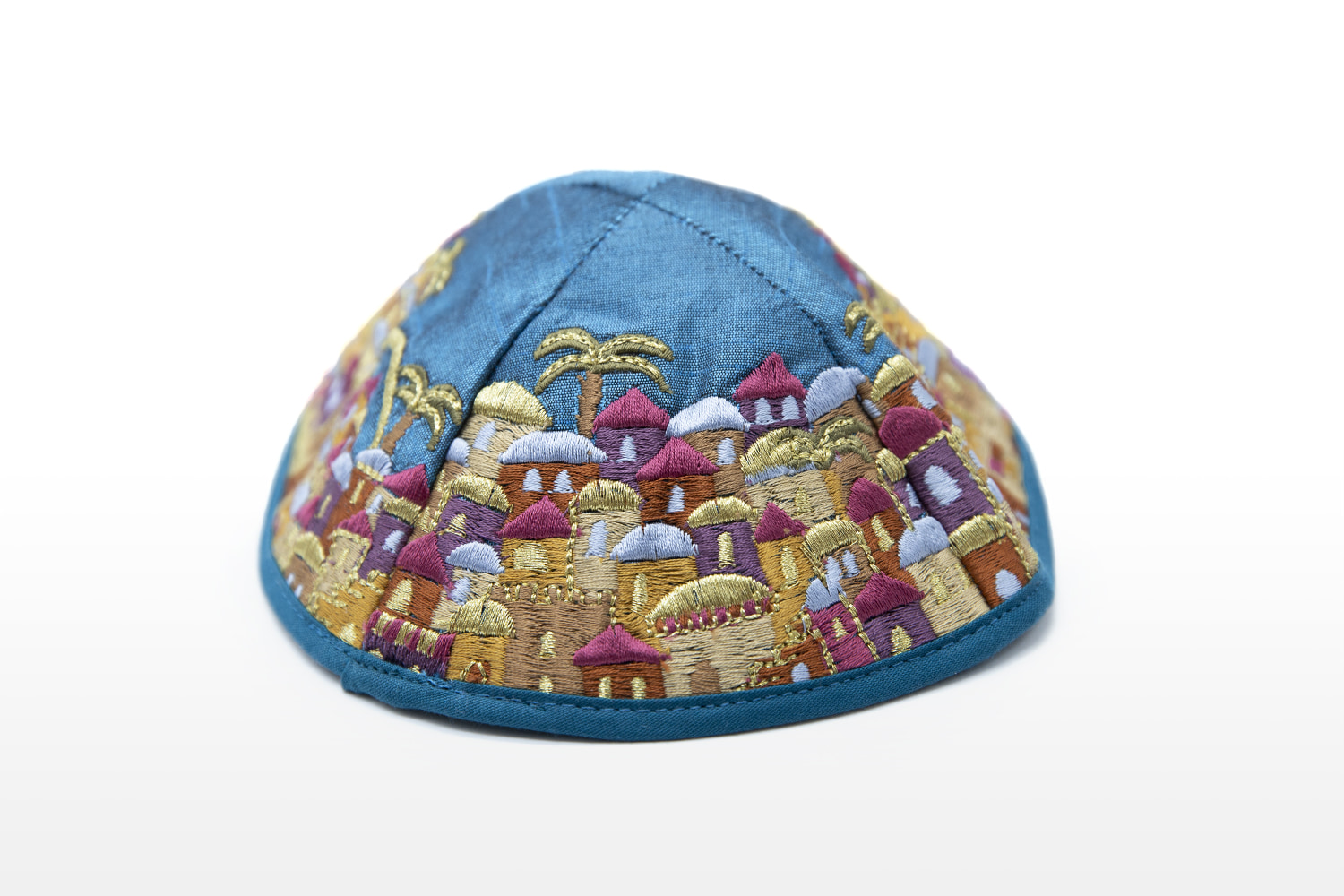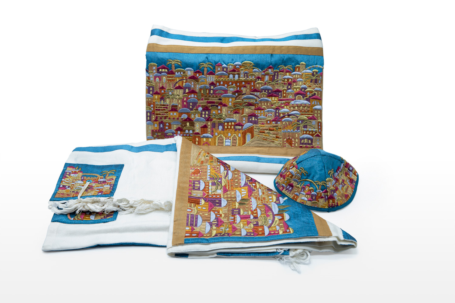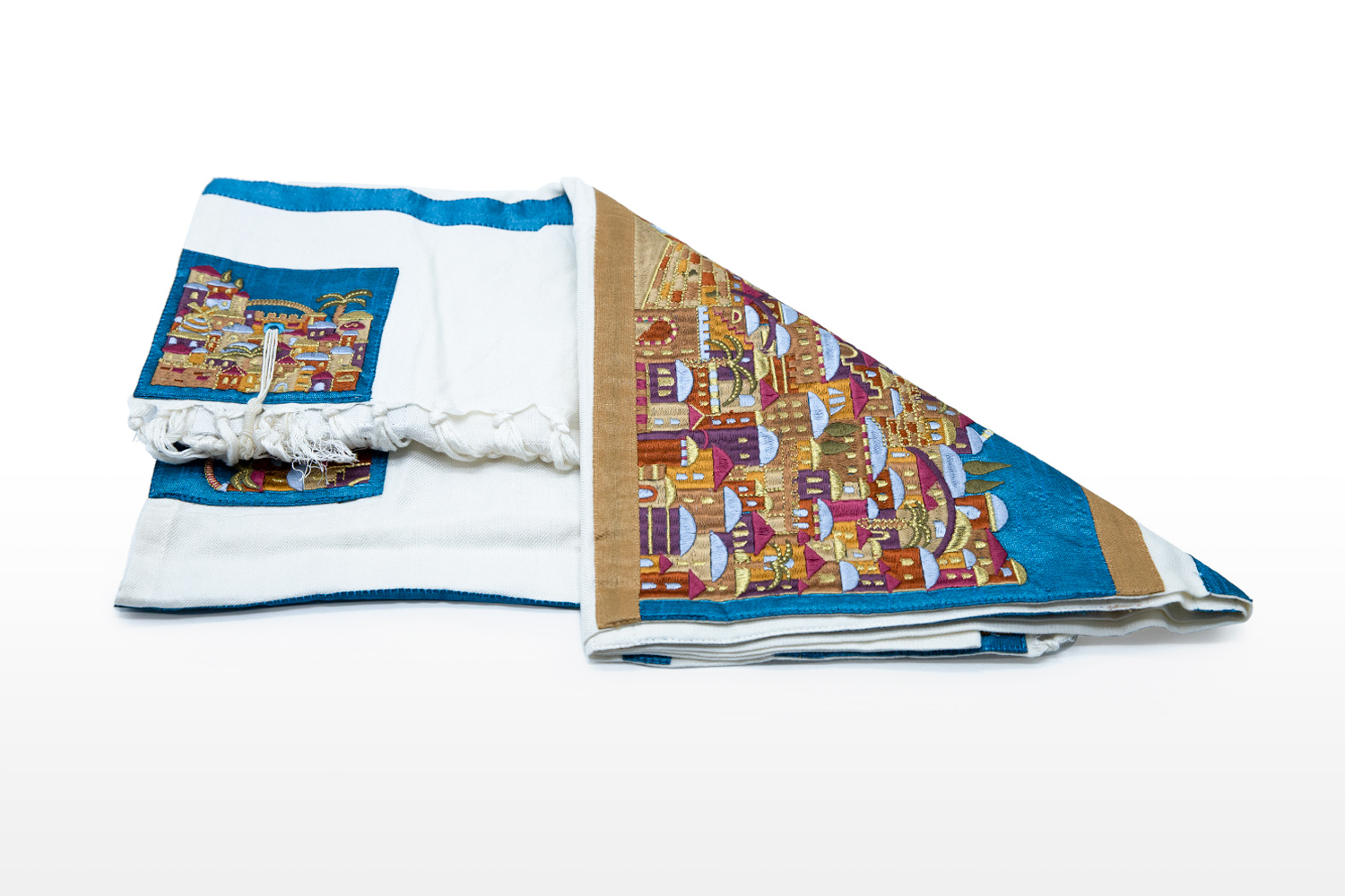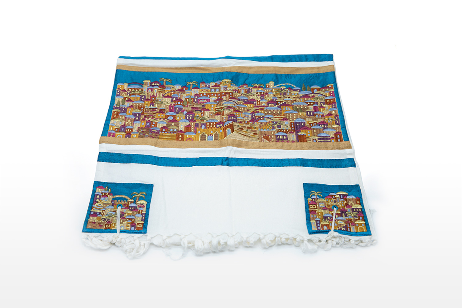 Emanuels embroidered Jerusalem tallit is stunning. Stitched in vibrant color with accent gold threads. The design shows the old city of Jerusalem with a beautiful blue sky.